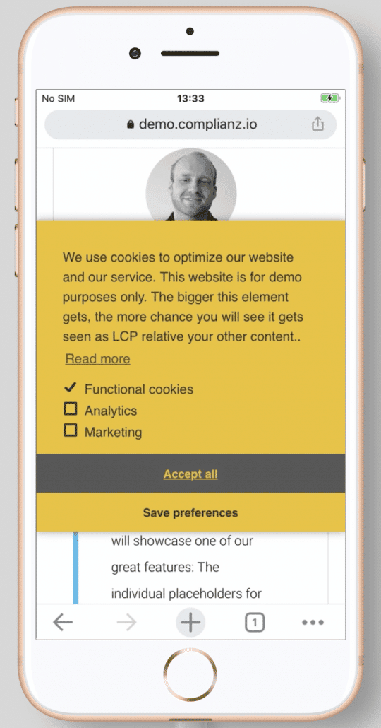 We will discuss LCP & CLS, as these are most common while dealing with Web Vitals and Complianz. And the discussion is related to mobile only, as the cookie banner will overlay a large part of your webpage during first visit.