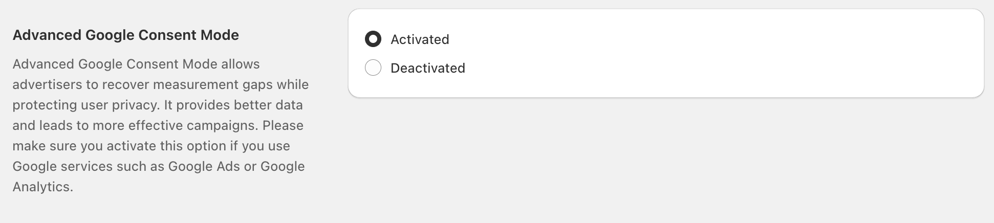 This will enable Complianz’ certified Consent Mode V2. It automatically connects to the Shopify Customer Privacy API for full consent coverage. Below you can choose 2 different settings.