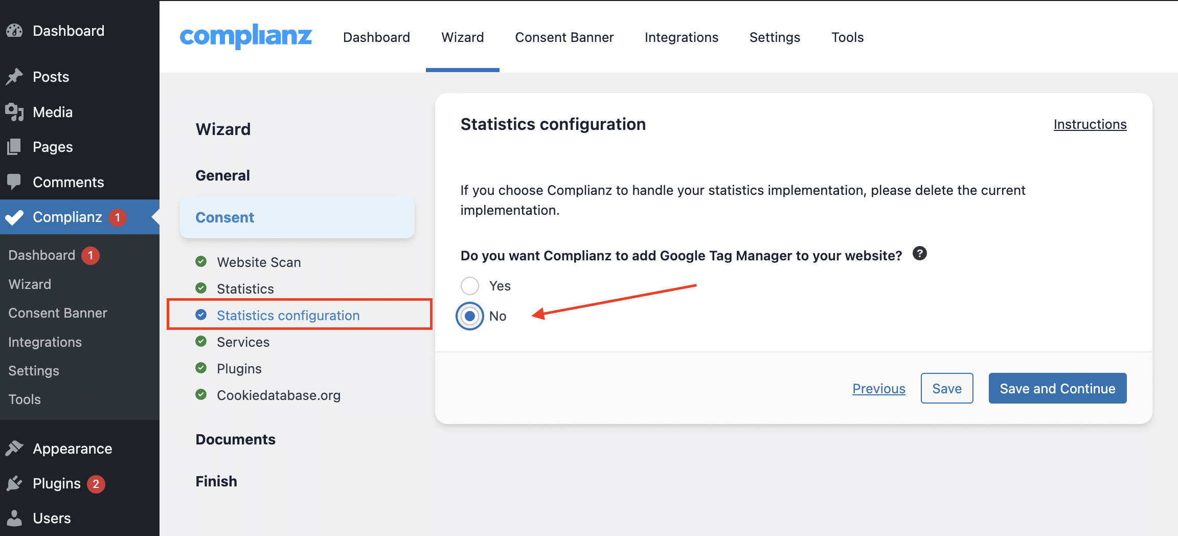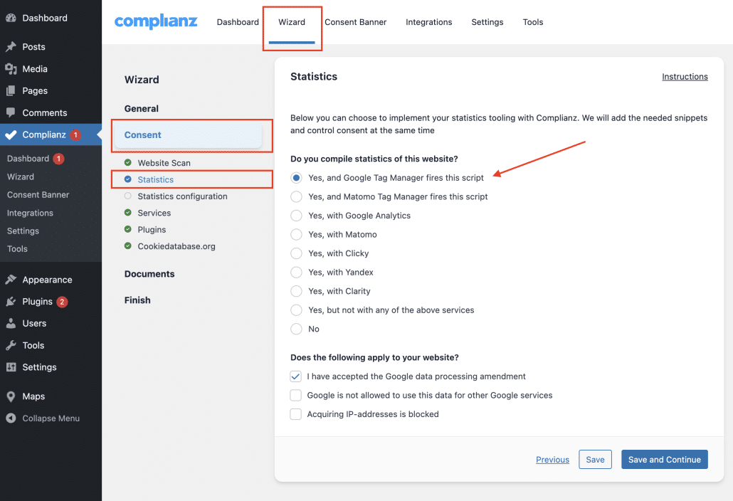 In the wizard, go to Wizard > Consent > Statistics and acknowledge the use of Google Tag Manager by selecting “Yes, and Google Tag Manager fires this script”