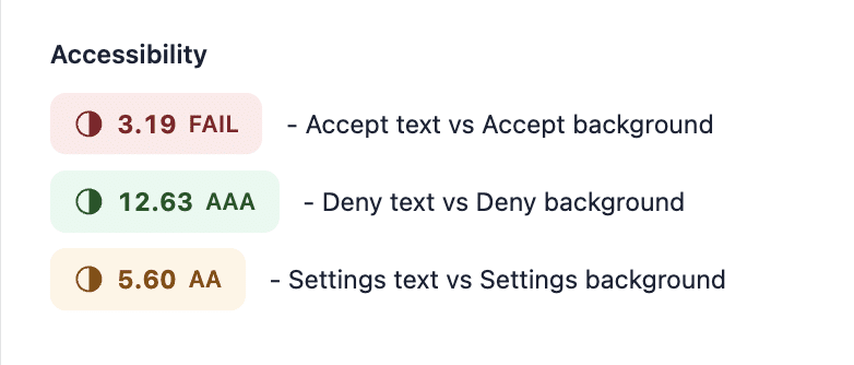 When you pick colors for your banner, for example, text, buttons, toggles, or links, the contrast checker tests them against these WCAG levels. It tells you whether your choices pass or fail, and what rating they reach.