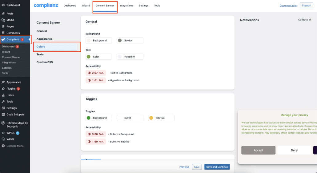 - The contrast checker only works inside the Complianz wizard. It doesn’t change how your banner looks on the live site until you save the changes.