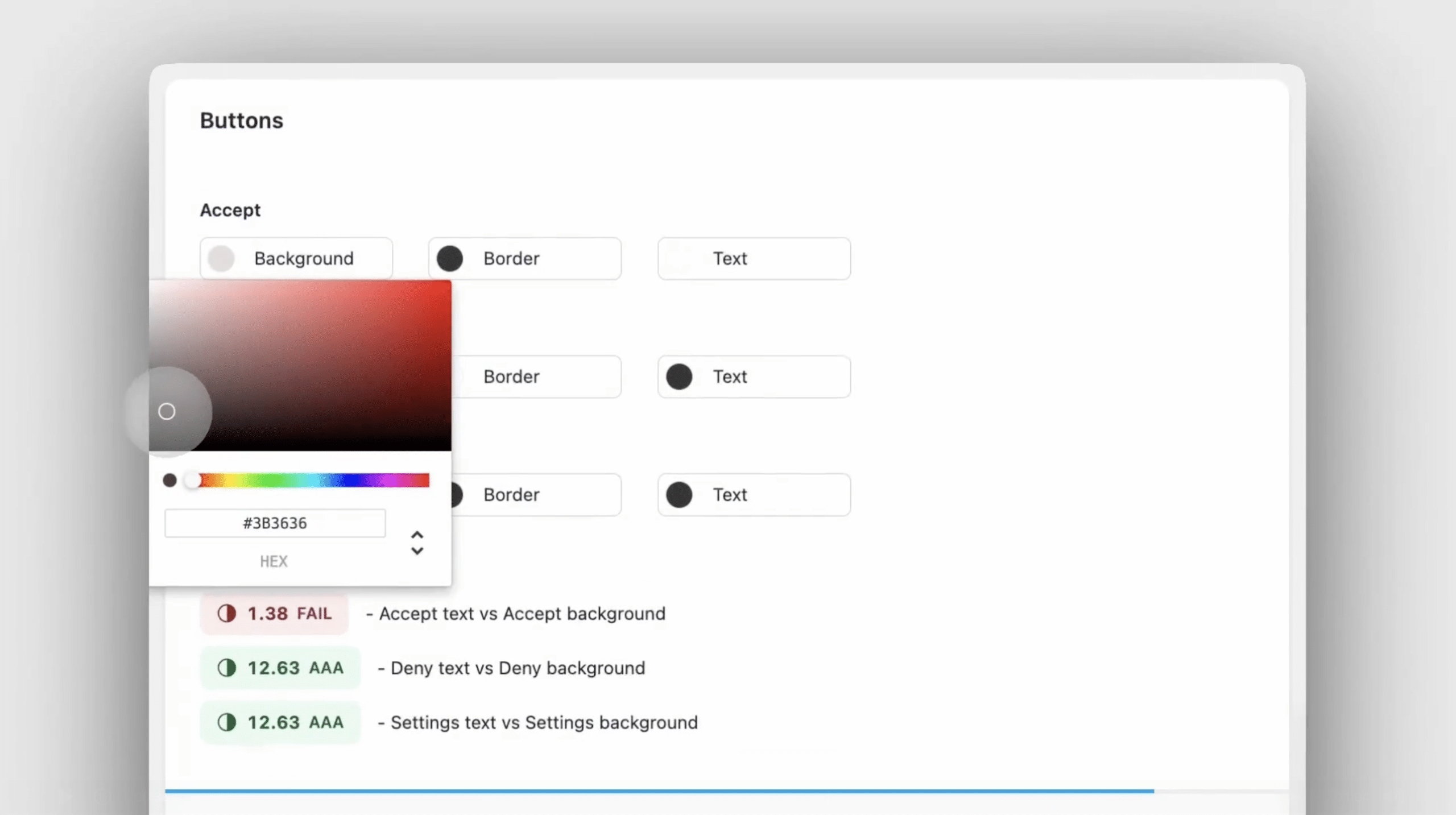 When you pick colors for your banner, for example, text, buttons, toggles, or links, the contrast checker tests them against these WCAG levels. It tells you whether your choices pass or fail, and what rating they reach.