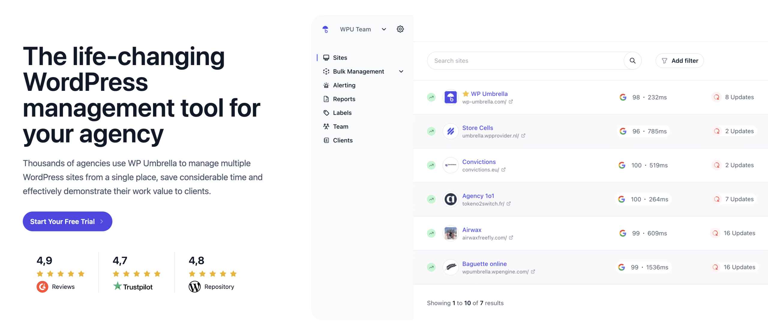 A WordPress Management tool like WP Umbrella helps agencies put multiple websites into one dashboard and run all their updates, backups, performance and security checks with just a few clicks.